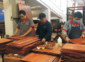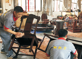 御乾堂紅木在細節上也體現著高水準,僅刮磨這一道工序就有平磨、花磨、拋光等八道工序和十五個作業標準,種種體現出生產管理規范化。